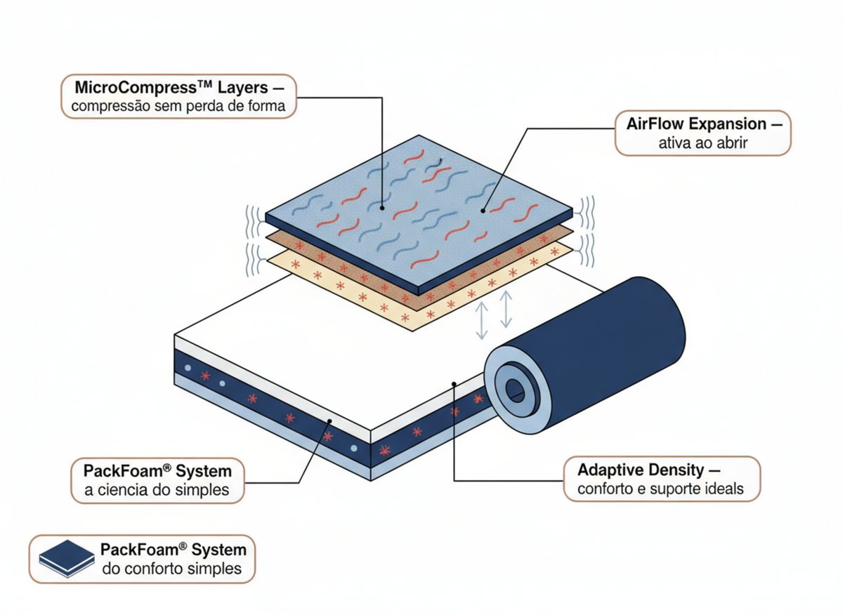 Quando o abres, a espuma especial expande-se automaticamente para a forma perfeita. Sem ferramentas, sem stress, apenas design e conforto puro.